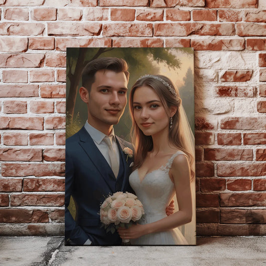 Jeśli zamiast humorystycznego ujęcia wolisz klasykę, oferujemy również portret pary młodej w eleganckim, artystycznym stylu. Może to być romantyczny obraz inspirowany malarstwem lub nowoczesny, stylowy portret na płótnie, który stanie się ozdobą ich domu.