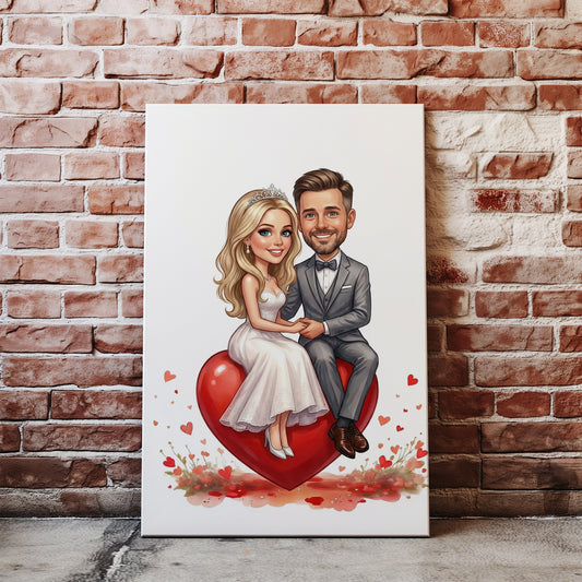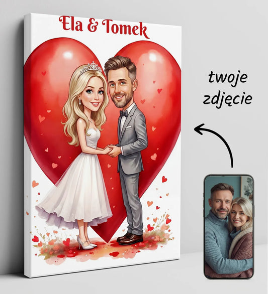 Karykatura pary na sercu – prezent dla pary młodej