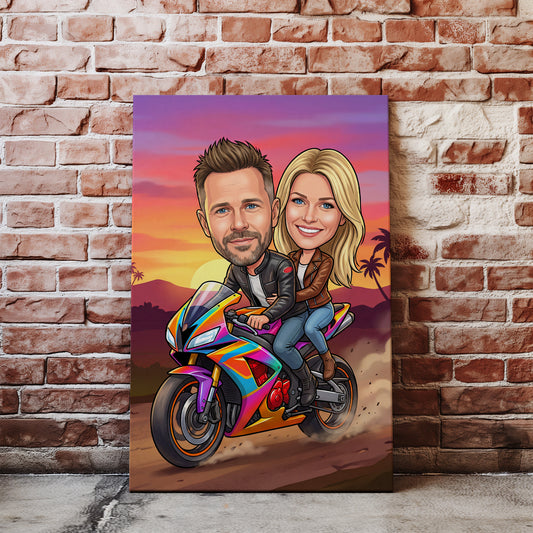 Karykatura pary na motocyklu – oryginalny prezent dla zakochanych