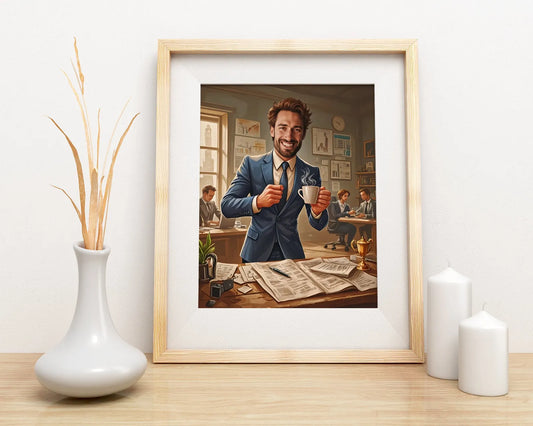 Nasze karykatury na zamówienie są dostępne w różnych formatach – możesz otrzymać je jako plik cyfrowy w wysokiej rozdzielczości, gotowy do wydruku, obraz na płótnie lub plakat.