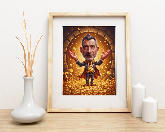 Karykatura na 60. urodziny – jubilat w skarbcu pełnym złotych monet