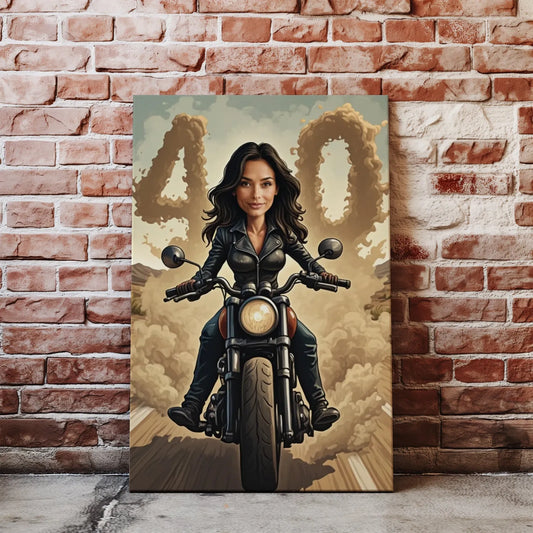 Karykatura kobiety na motocyklu – prezent na urodziny z cyfrą