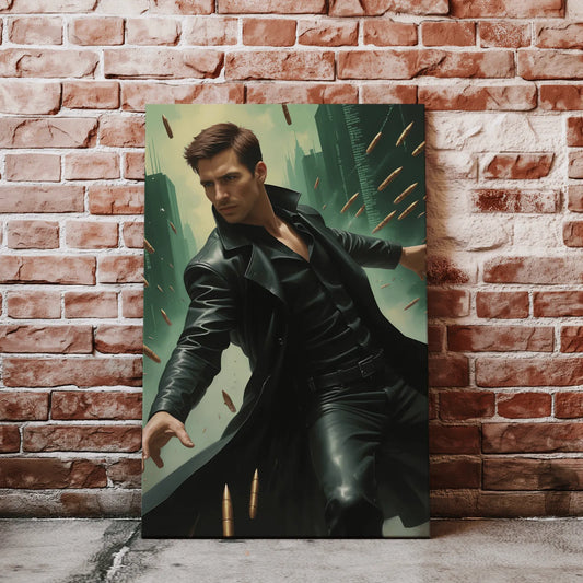 Portret filmowy Neo w scenie unikania kul z Matrixa