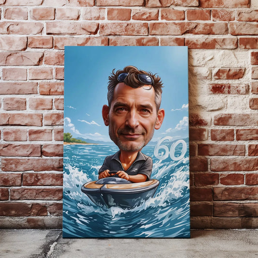 Prezent dla kolegi na urodziny - karykatura na motorówce