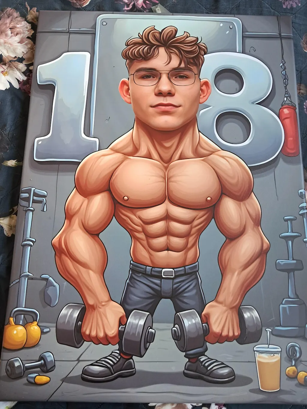 Szukasz prezentu dla fana siłowni lub kulturysty? Ten wyjątkowy portret przedstawia bohatera z Twoją twarzą, w formie pełnej mięśni karykatury sportowej! Rzeźbione ciało, hantle, ławeczka i tło jak z profesjonalnej siłowni, a w tle imponująca cyfra urodzinowa (np. 35, 40, 50 – do wyboru przez klienta) wykonana z chromowanych hantli. To świetna propozycja dla każdego, kto kocha trening siłowy, kulturystykę i sportowy styl życia.