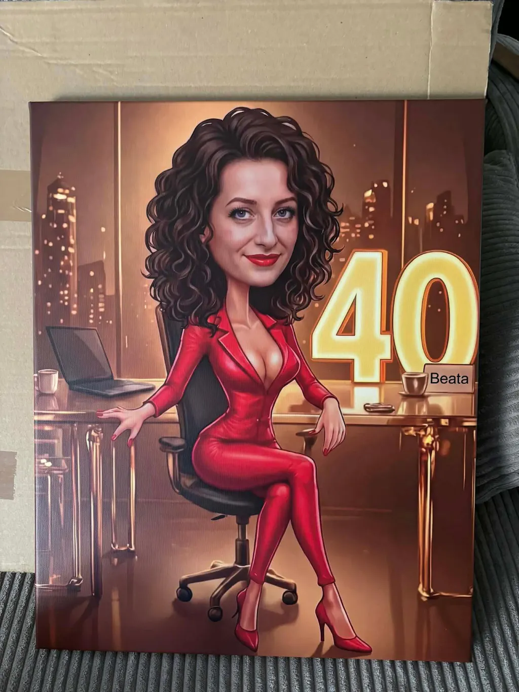 Zamów wyjątkową karykaturę kobiety jako nowoczesnej bizneswoman – idealny prezent na 40. urodziny dla liderki z klasą! Ilustracja przedstawia pewną siebie kobietę siedzącą przy luksusowym, przeszklonym biurku. Obok jej imiennej tabliczki świeci duża cyfra „40” – symbol siły, dojrzałości i sukcesu. Stylizacja obejmuje czerwony żakiet, szpilki i eleganckie dodatki, a za oknem widać panoramę miasta.