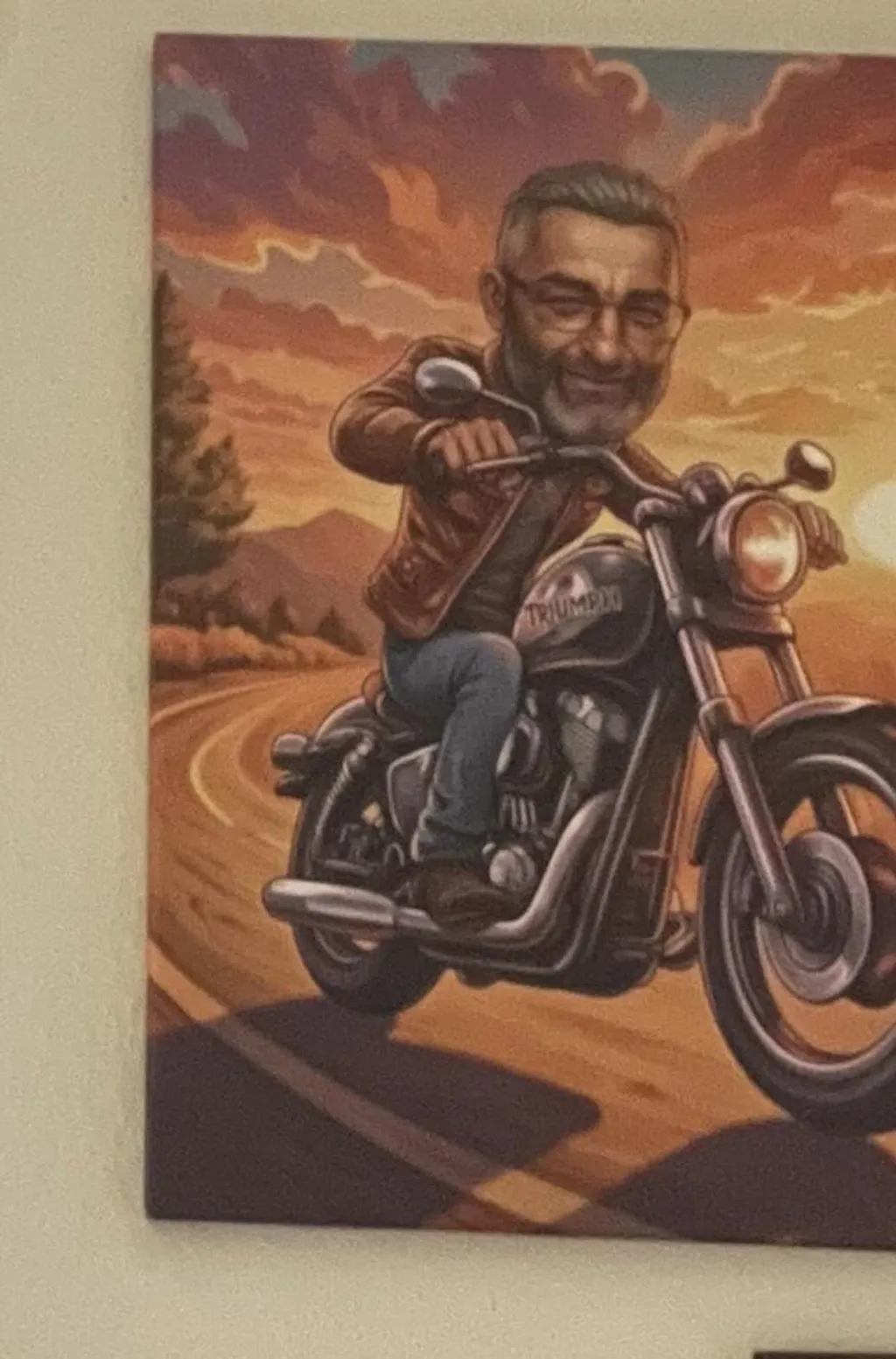 Stworzenie takiego obrazu zaczyna się od karykatury ze zdjęcia, co pozwala na idealne odwzorowanie rysów twarzy, a następnie dodanie elementów związanych z motocyklowym stylem życia – skórzanej kurtki, charakterystycznego kasku czy potężnej maszyny w tle.